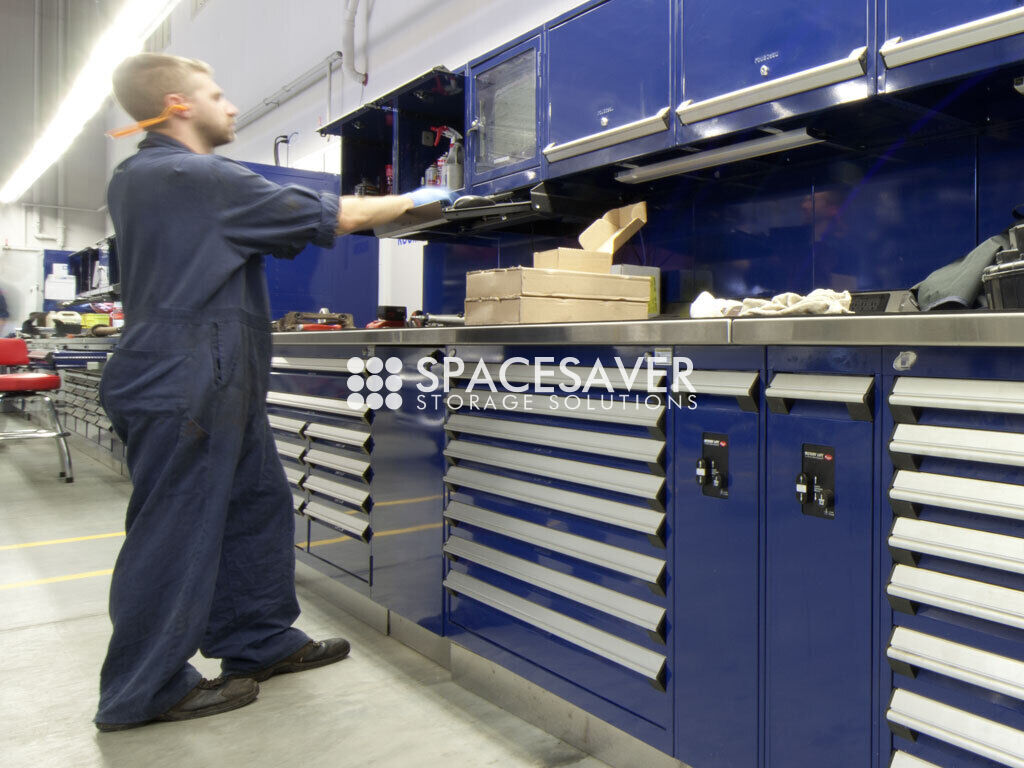 In the parts department, a combination of shelving drawers, mini-racking systems, and hanging panels allows for efficient storage of both small and irregularly shaped items. The result is a flexible, industry-specific system that improves accessibility and organization.