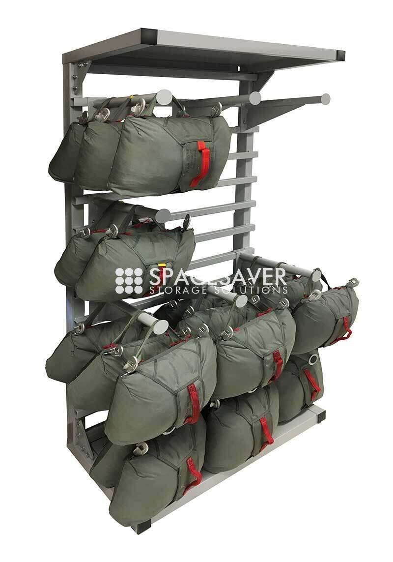 Spacesaver’s Cantilever Rack for Parachutes is designed for organizations that want a safe, user-friendly way to store bagged or packed parachutes. The system keeps chutes off the floor, out of harm’s way, and easily accessible during busy rigging schedules.