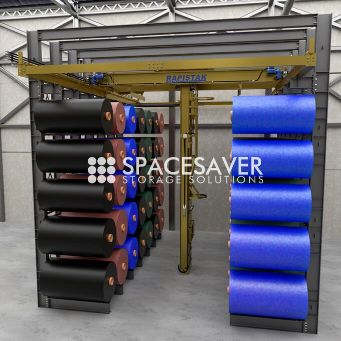 SKARAB Stacker Storage Management Systems help to prevent roll surface damage while providing a dense, organized storage system. Whether storing plastic film, print drums, fabric or die rolls we have you covered. By storing up, instead of out, you will save floor space, increase productivity and create a safer working environment.