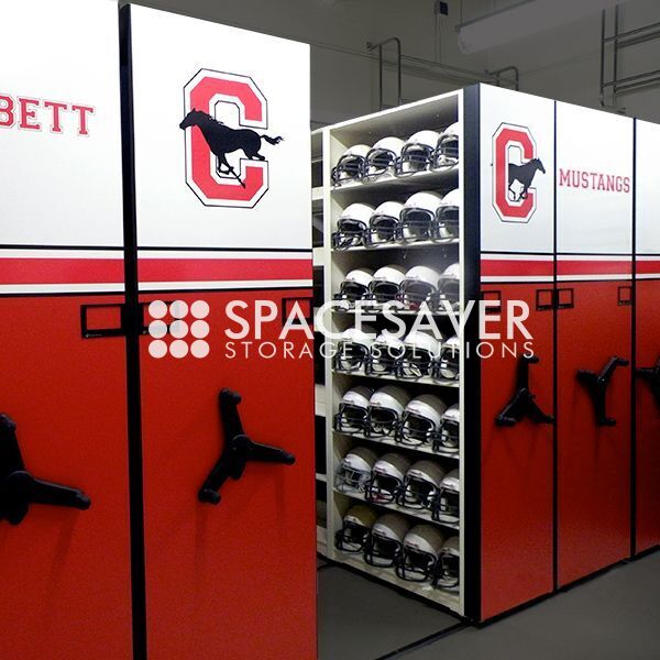 When one high school expanded its athletic facilities, the staff wanted to improve storage security and organization for multiple sports. Their Spacesaver consultant designed a High-Density Mobile Storage System with 4-Post Shelving and locking tambour doors to keep equipment safe and accessible.